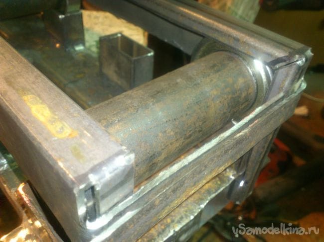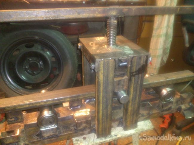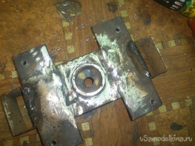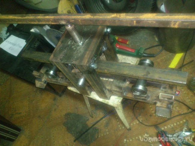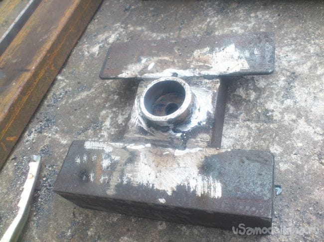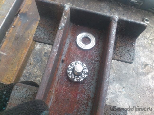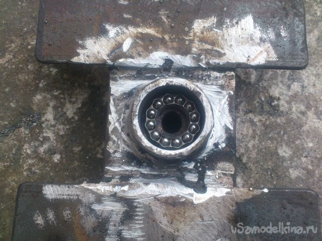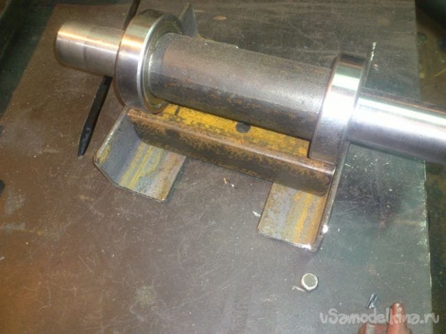 После чего я приварил к станине вертикальные стойки и посадочные для подшипников: