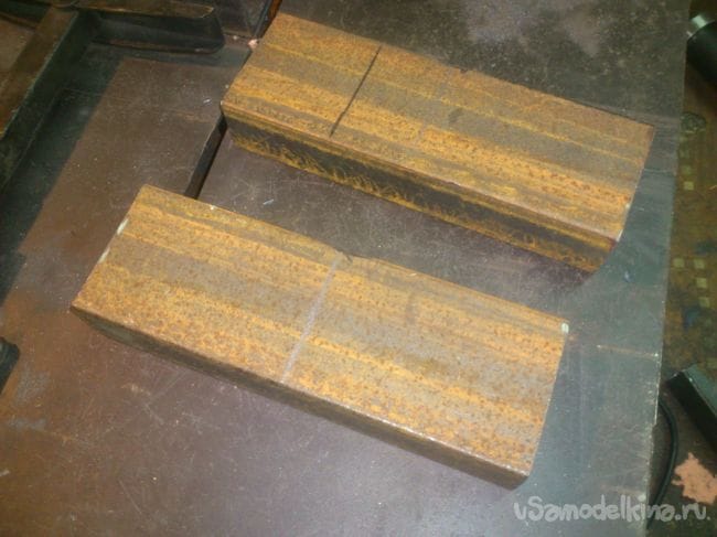 После чего я разрезал их вдоль по широкой части, разделив стенку на 10 и 40 мм. При этом, с другой стороны я разметил этот размер зеркально. У меня получились четыре вот таких заготовки: