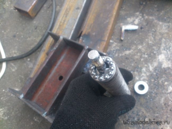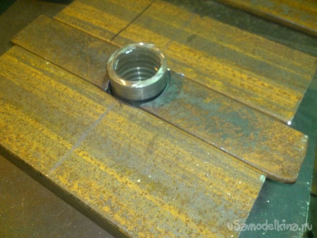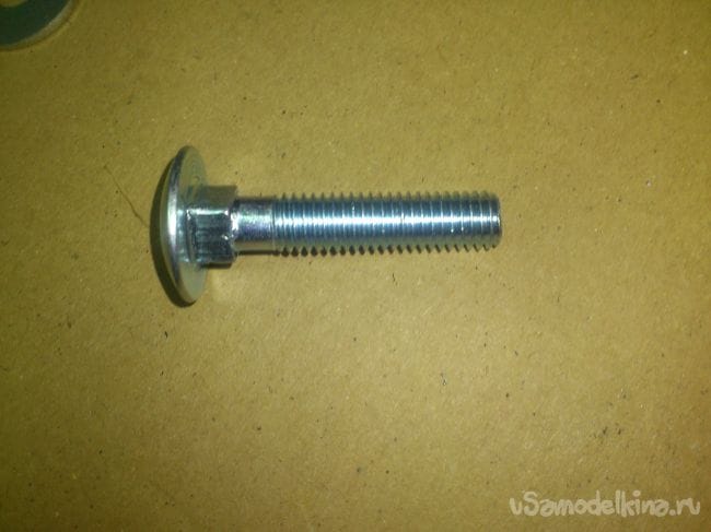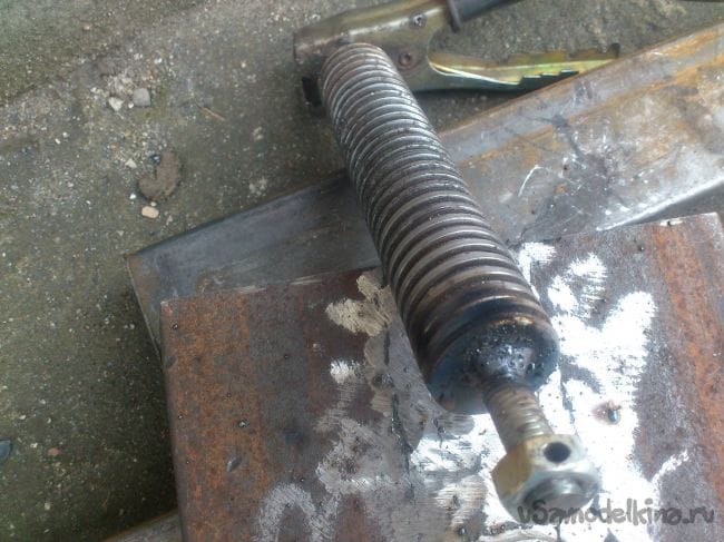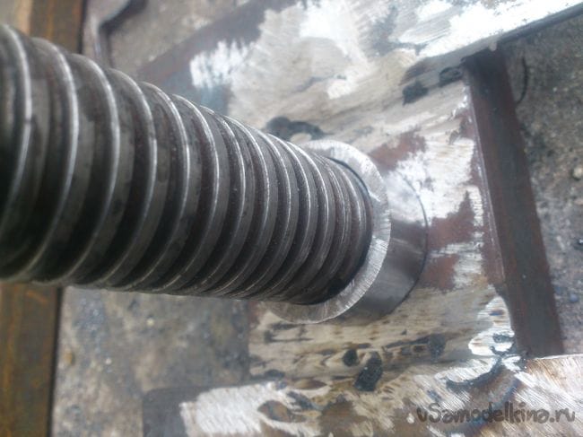 Сам винт был диаметром 30 мм. В его торце, сверлом 8мм я просверзил глухое отверстие, забил туда шпильку и прихватил её сваркой: