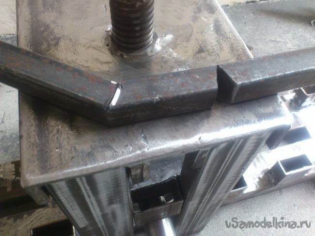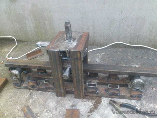 По бокам каретки я приварил по обрезку профильной трубы 50 на 20 - это будут направляющие, а в углах просверлил отверстия и нарезал резьбу М6 . В них вкрутятся болты крепления хомутов ведущего вала.