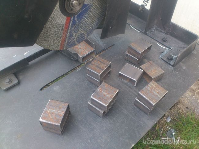 Я решил сделать по три положения для каждого вала. Посадочные для подшипников я тоже сделал из профильной трубы, поэтому отрезал 12 одинаковых отрезков по 50 мм каждый. (Здесь , и не только здесь, мне очень помог мой самодельный отрезной станок, о котором я вам рассказывал в предыдущей публикации):