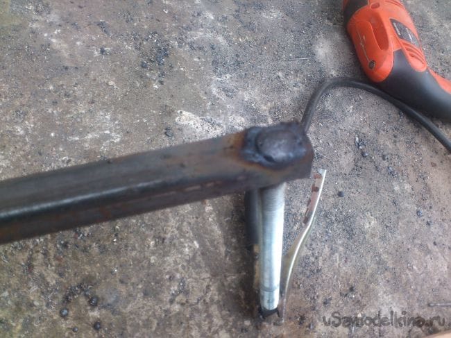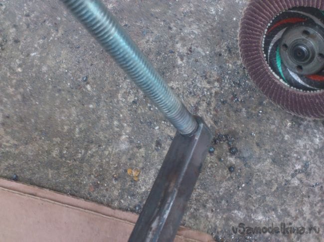 Далее я приступил к изготовлению приводной рукоятки...Саму рукоятку я решил изготовить из профильной трубы 15 на 15 и шпильки. Просверлил в конце отверстие, вставил в него обрезок шпильки М14, приварил и зачистил: