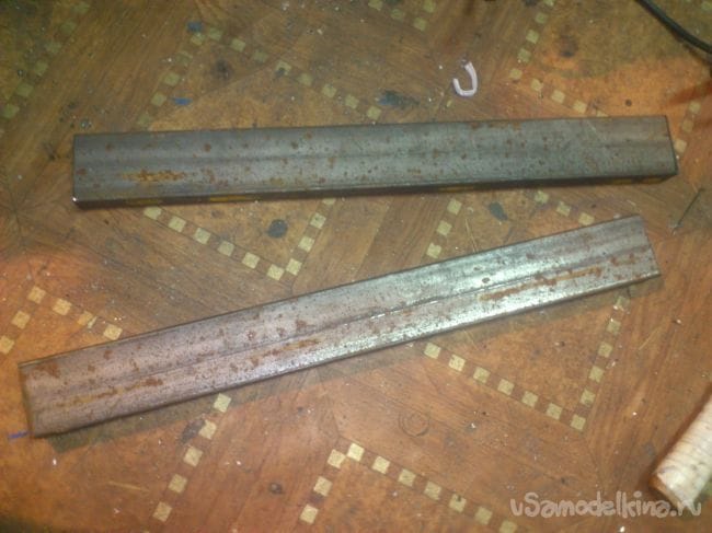 ... Но такая конструкция противоречила моему другому требованию - мобильности! Ведь при переноске станка валы приходилось бы снимать и переносить отдельно... При этом, с них нужно было бы снимать подшипники (Я проточил под неплотную посадку и они могут спадать). Это меня не устраивало. Поэтому я решил изготовить деталь, которая прижимала бы подшипники сверху и фиксировала их. Я взял два отрезка профильной трубы, сечением 50 на 20 мм, стенка 2мм.