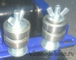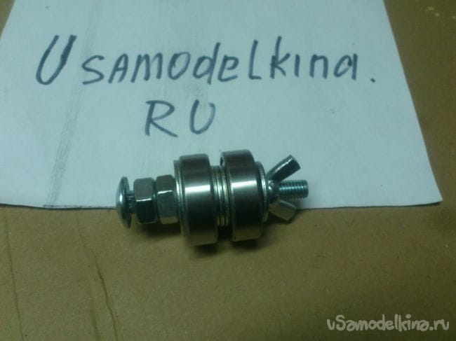 Сами ограничители собрал (каждый) из мебельного болта М8, двух гаек М10 (одел на болт чисто для высоты) и двух подшипников № 202. Внутрь напихал ещё шайб. Весь этот "бутерброд" я стянул барашковой гайкой. Внутрь подшипников вставил по обрезку подходящей трубки, чтобы они не болтались на болтах))))):