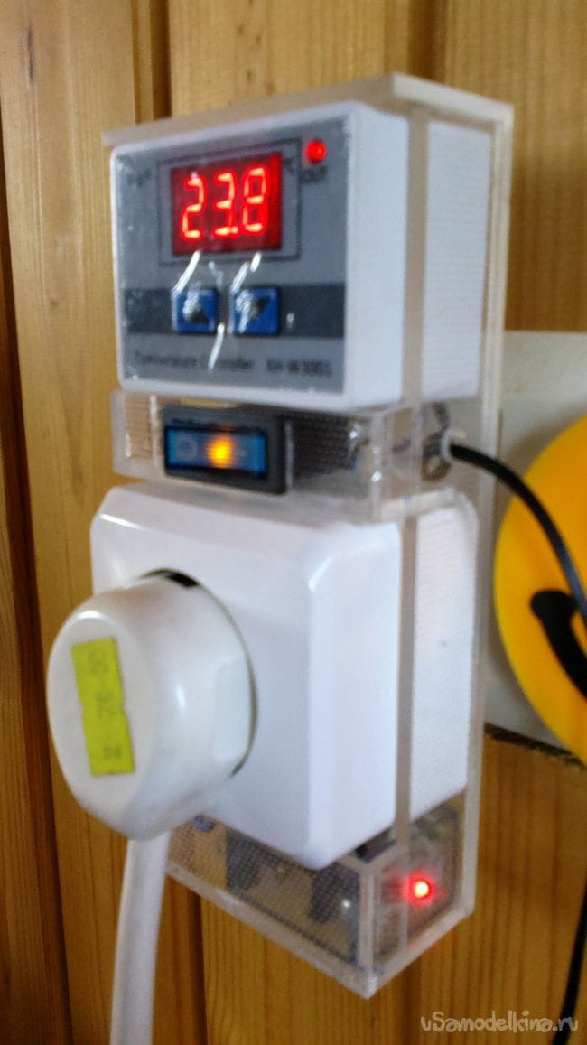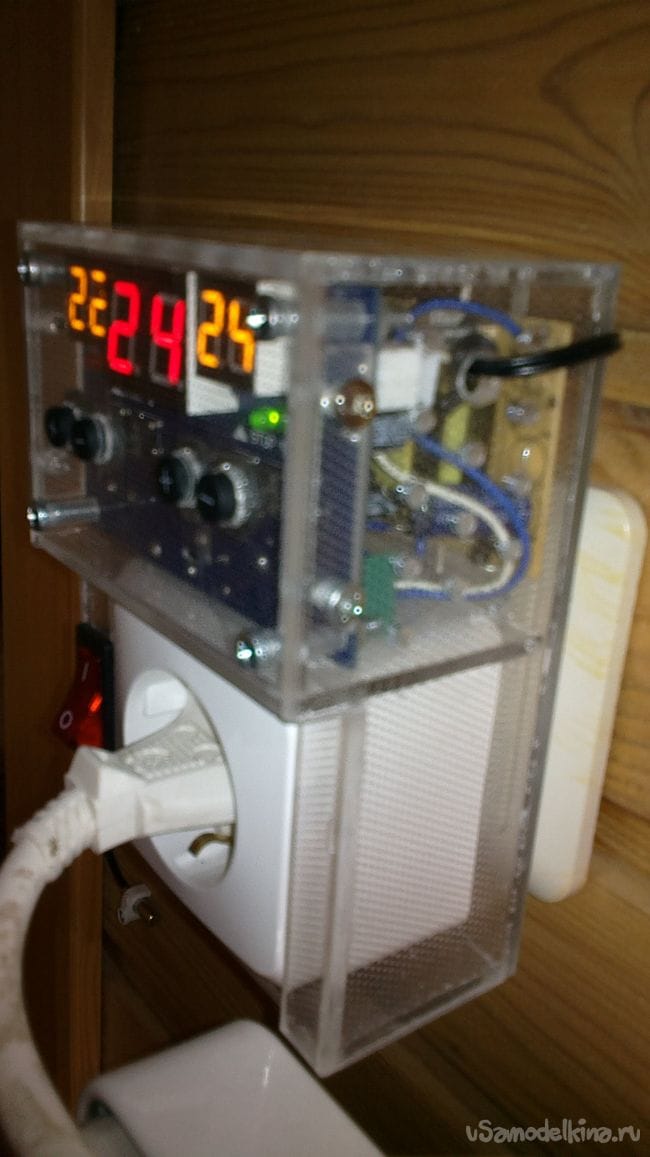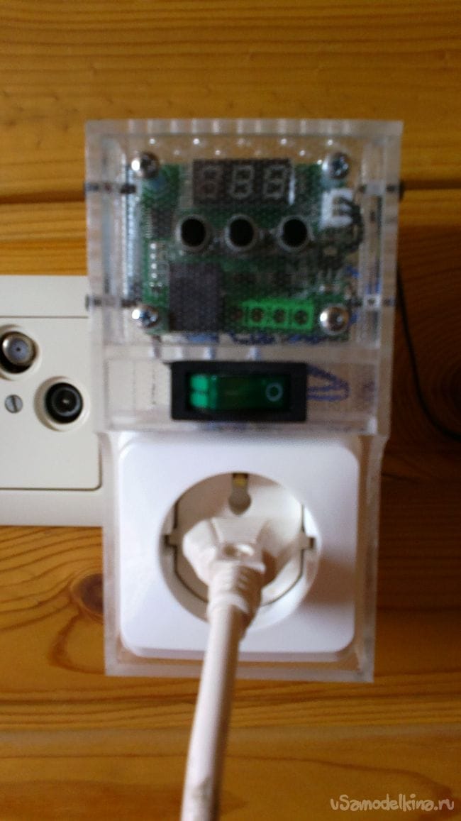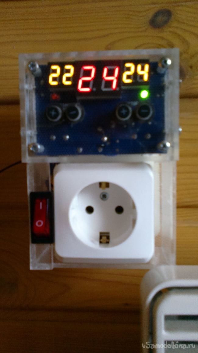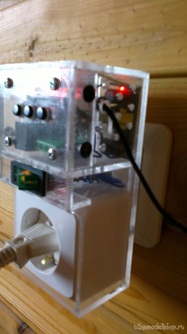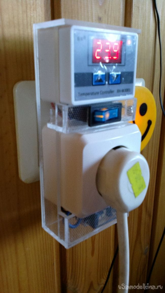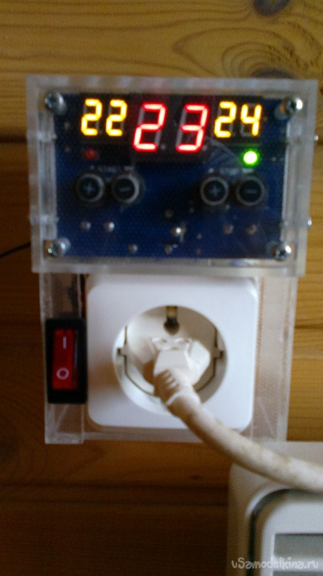 Терморегулятор для дачного обогревателей. Представляет, как переходник между розеткой и вилкой обогревателя. За основу взяты готовые платы (заказаны на AliExpress). Платы все разные, было добавлено дополнительное реле для увеличения мощности. Корпуса регуляторов выполнено из акрилового стекла (прозрачного пластика).