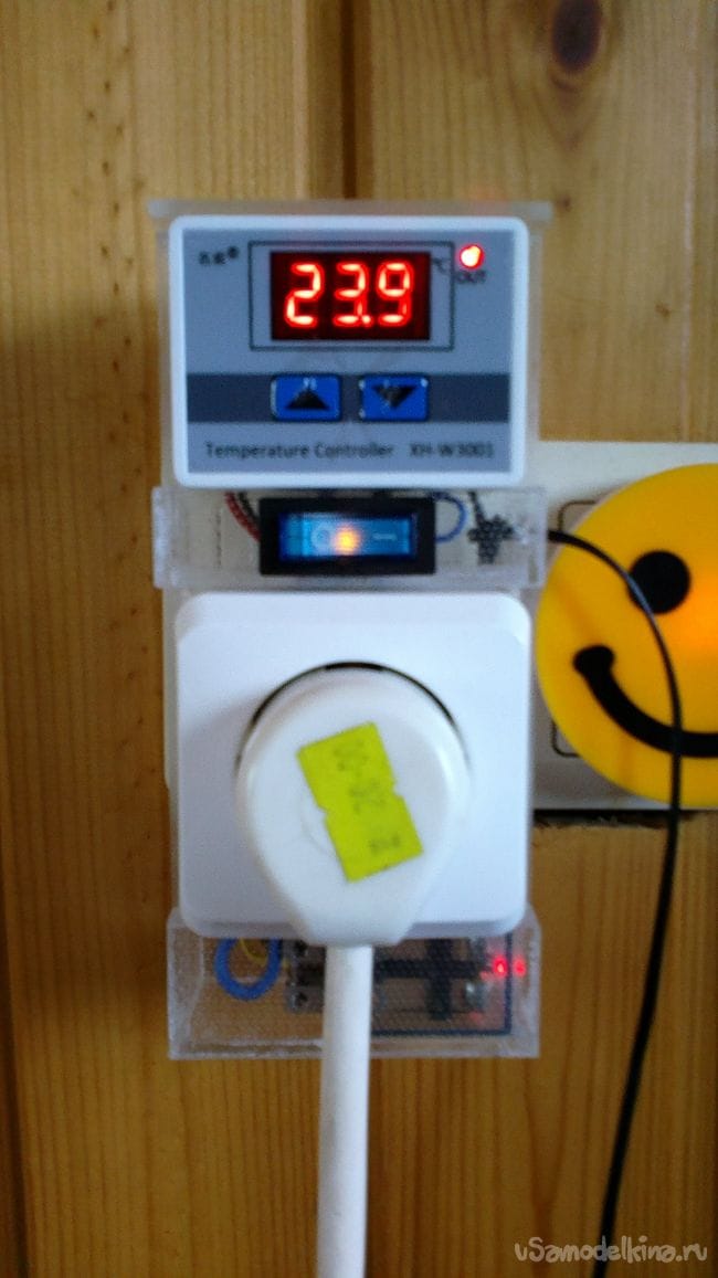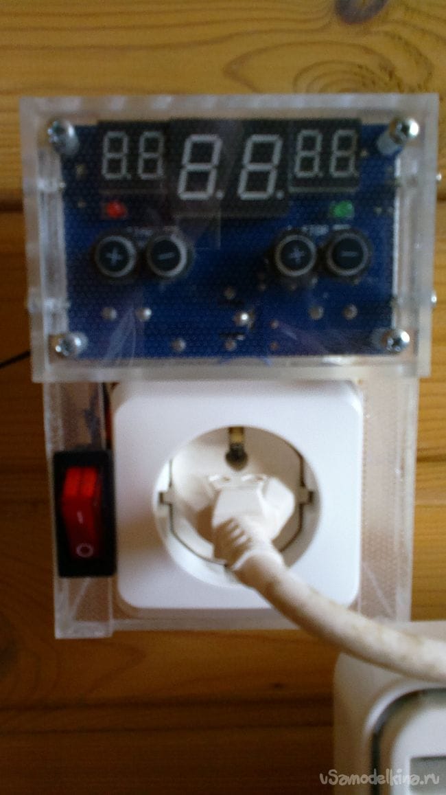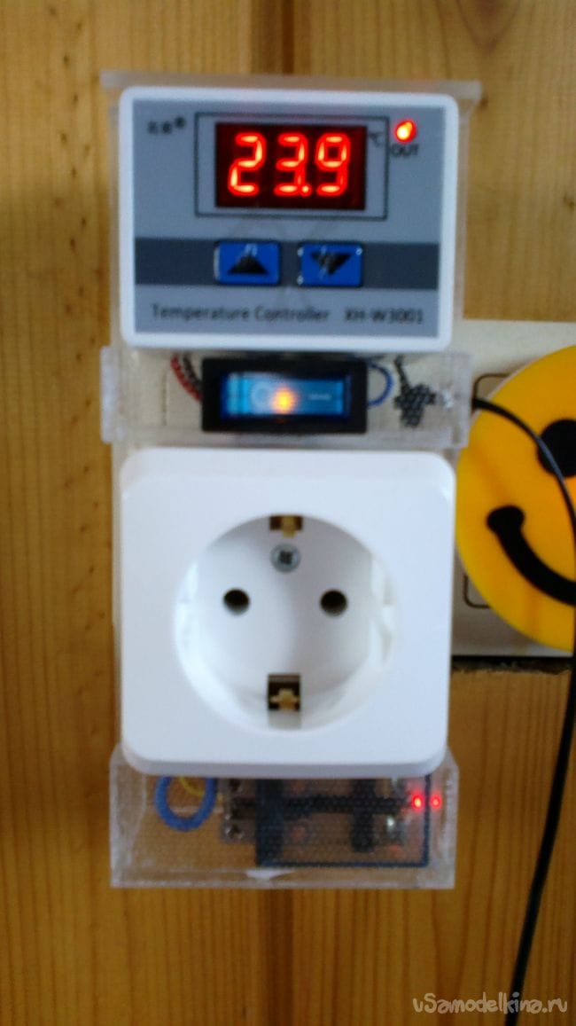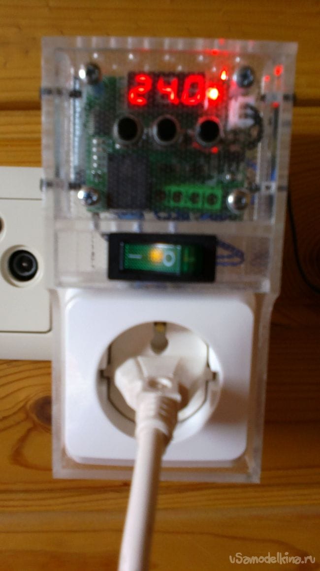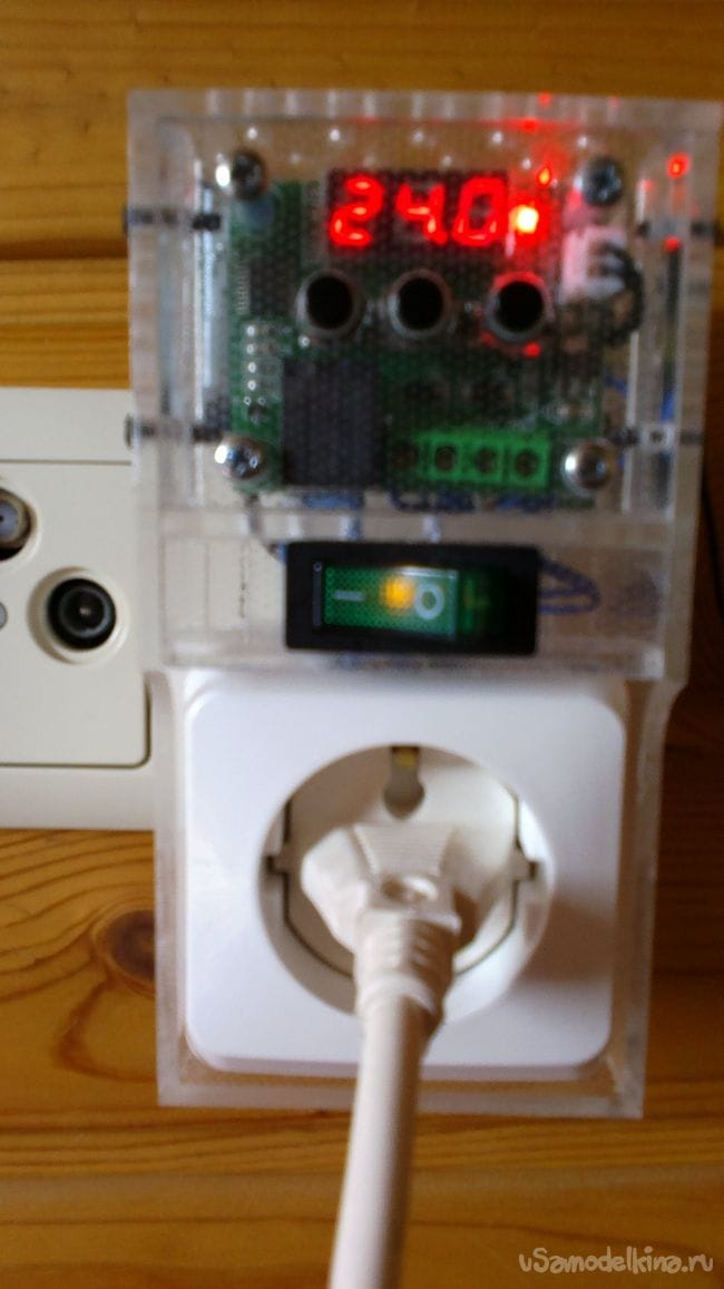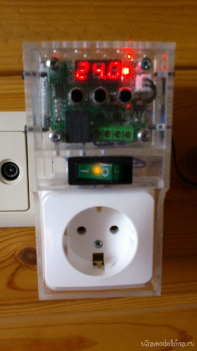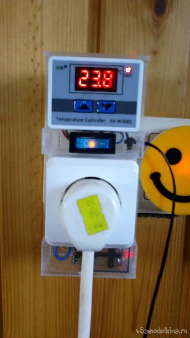 Терморегулятор для дачного обогревателей. Представляет, как переходник между розеткой и вилкой обогревателя. За основу взяты готовые платы (заказаны на AliExpress). Платы все разные, было добавлено дополнительное реле для увеличения мощности. Корпуса регуляторов выполнено из акрилового стекла (прозрачного пластика).