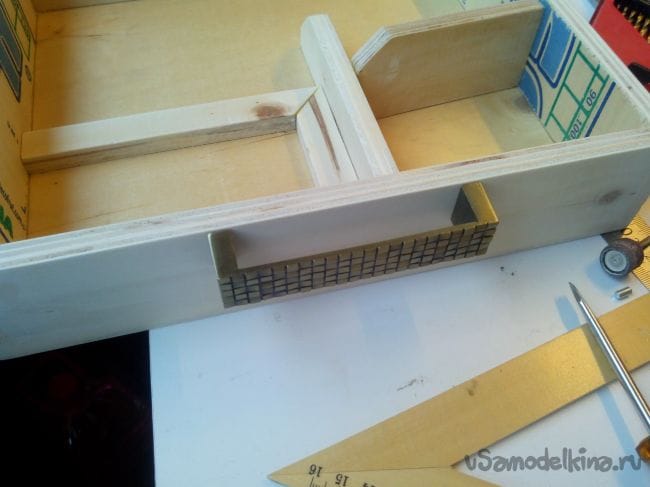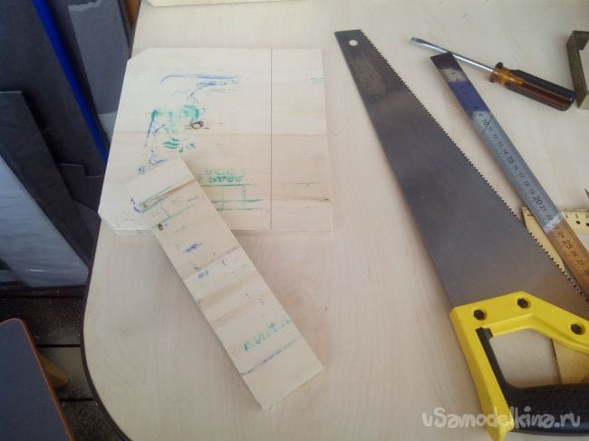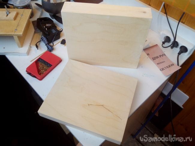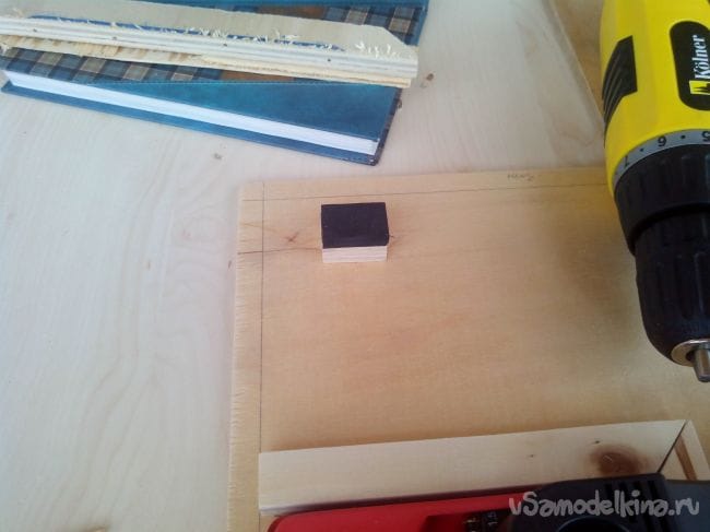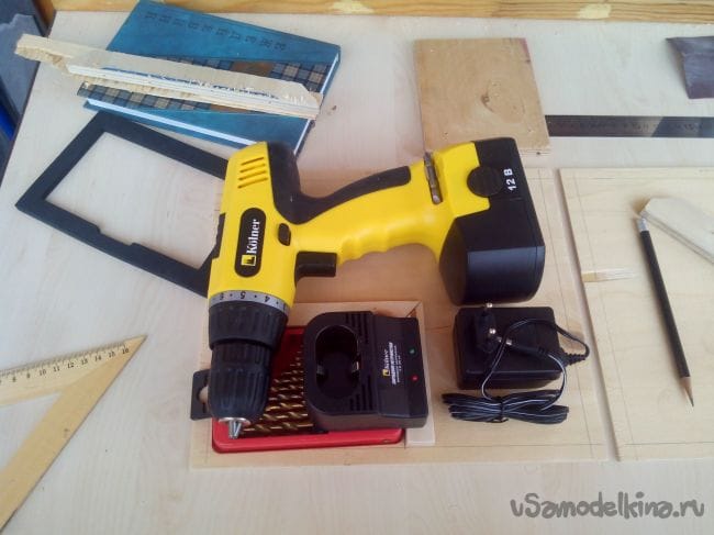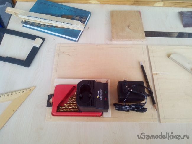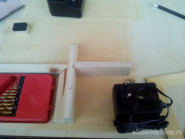Из толстой фанеры выпиливаем стенки отсека для блока питания. Эти стенки также будут фиксировать сам шуруповерт.