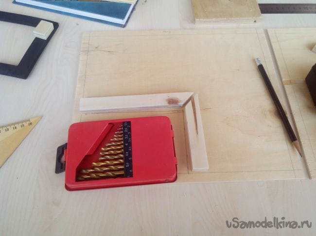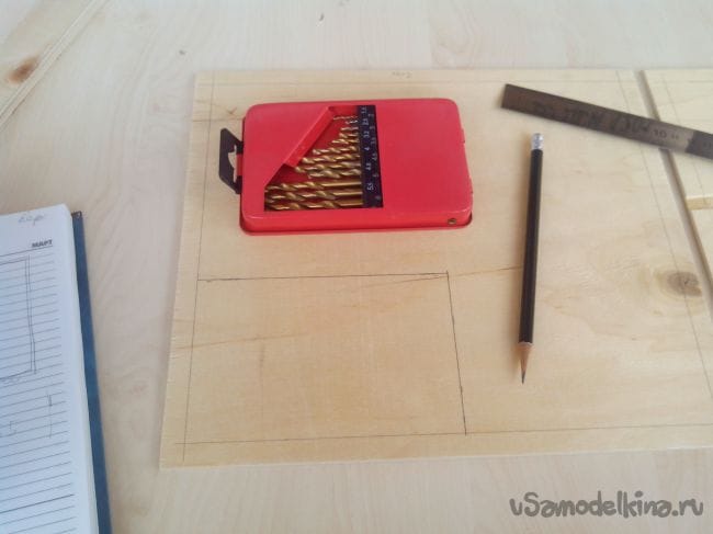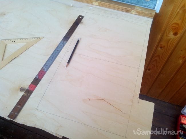 Начнем с главных частей – основы крышек чемодана из тонкой фанеры. Размечаем их с помощью линейки и угольника.