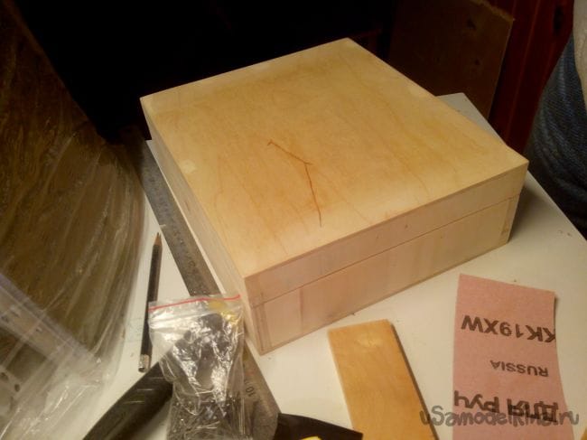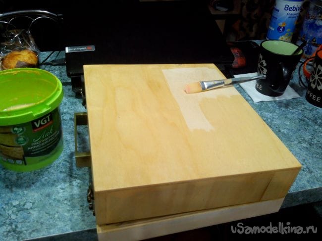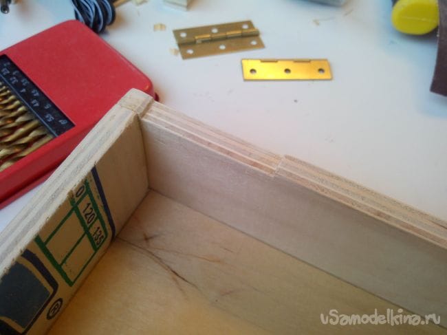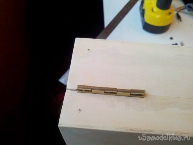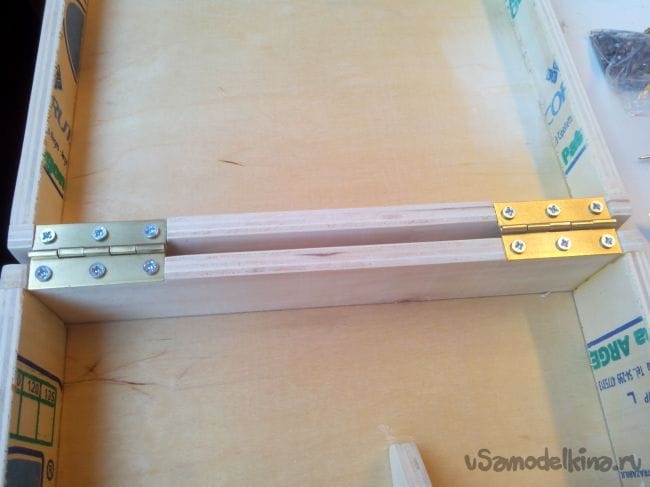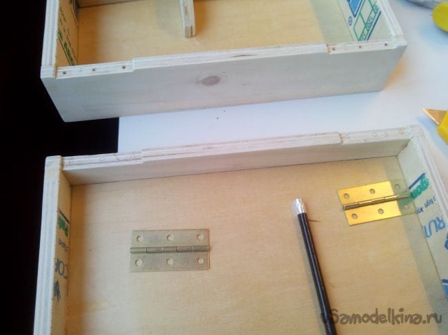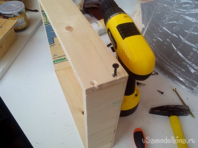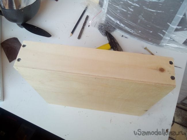 Когда рамки боковин подсохли, приклеиваем к ним крышки и прихватываем мелкими гвоздиками.
