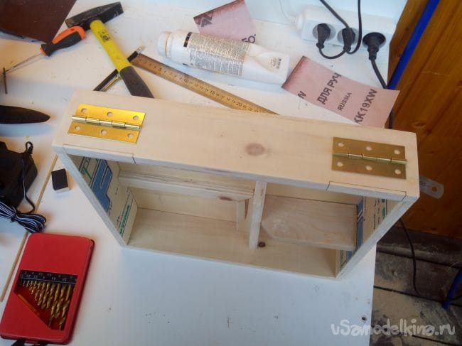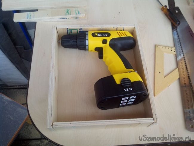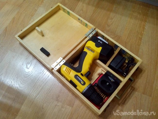 После высыхания лака укладываем внутрь сверла, шуруповерт, блок питания и зарядное устройство. Как видно на фото, осталось место для рулетки и пары карандашей.