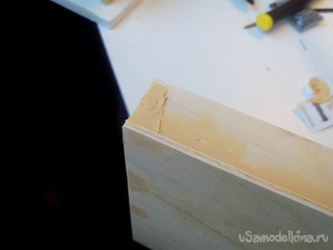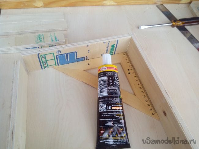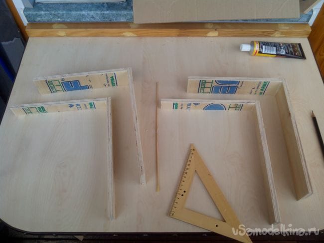 Клеем ПВА начинаем склеивать рамку из боковых стенок, не забываем про угольник.