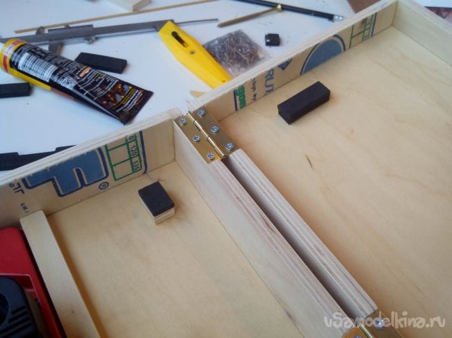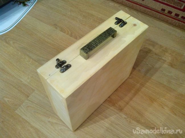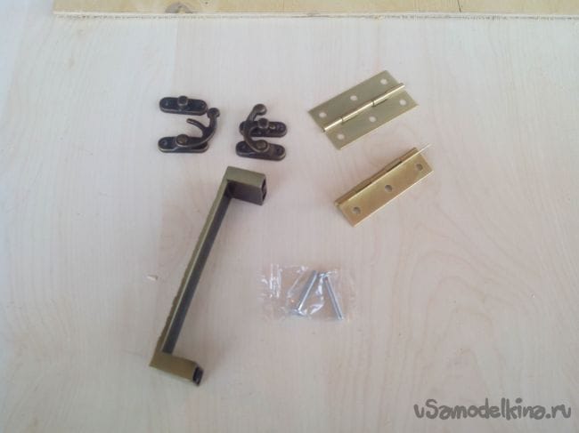 Ручку, петли и замки-крючки пришлось покупать в магазинах (в мебельном, строительном и для рукоделия соответственно). Хотя, при наличии старого чемодана, можно все это выкрутить и с него.
