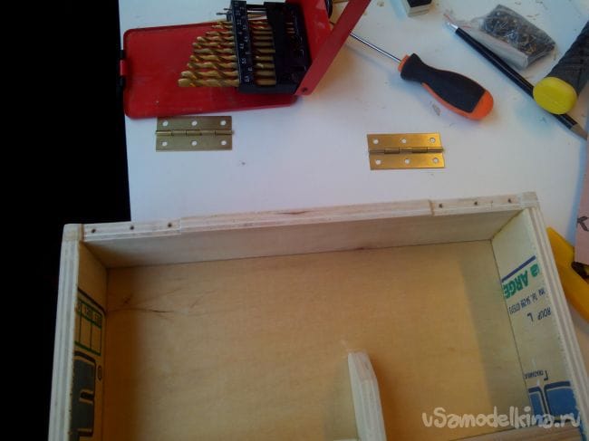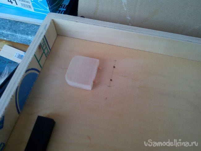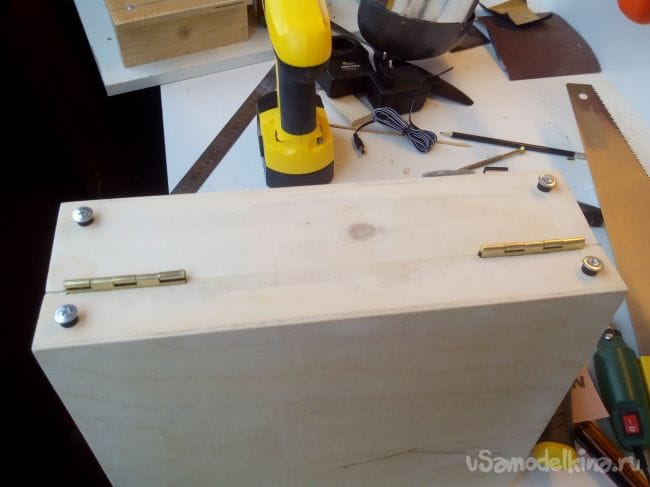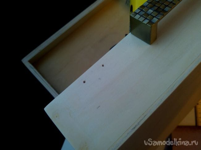 Отмечаем и сверлим в нижней части чемоданчика места под ножки (чтобы из-за петлей он не кувыркался на полу).