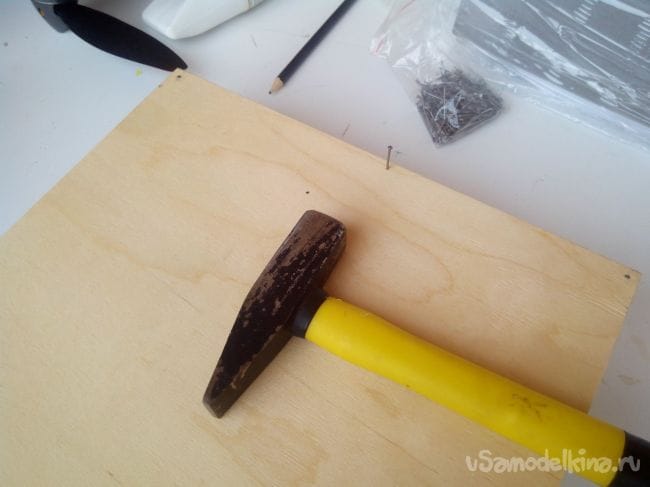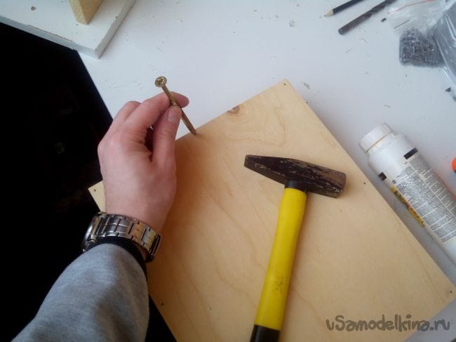 Чтобы гвоздики не выступали, забиваем их в дерево с помощью крупного самореза или гвоздя.