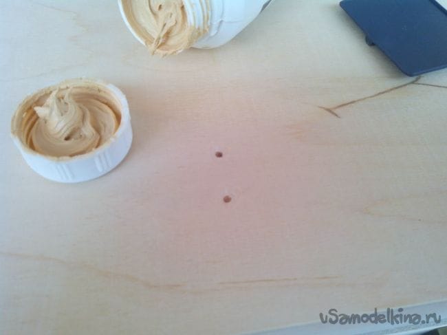 С помощью шпателя или пластиковой карты шпаклюем гвоздики в крышках.