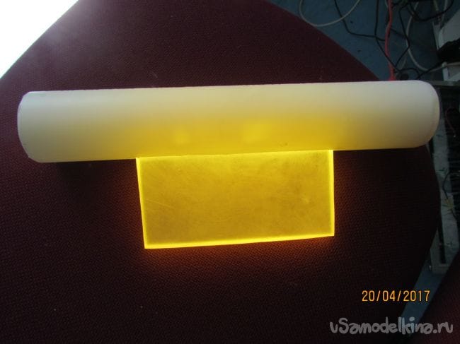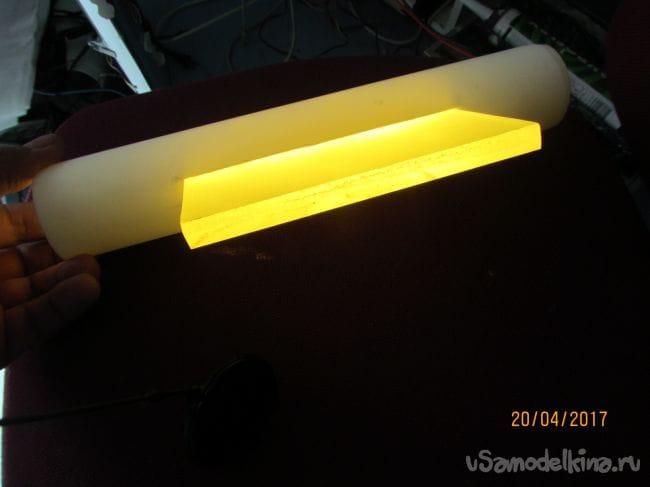 Для поплавка я взял кусок трубы из пластика диаметром 50 мм, пропилил там отверстие по толщине оргстекла и вставил туда оргстекло и залил все внутри монтажной пеной, когда пена высохла я обрезал лишнее и подключил питание.