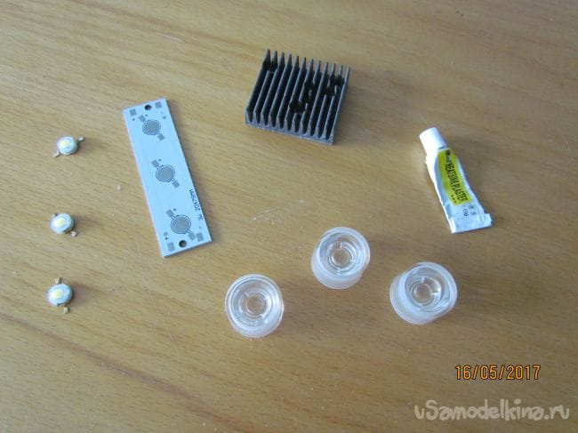 Вот что для этого нужно. Плата из алюминия для пайки светодиодов, радиатор, три светодиода по 1 ватту и термоклей. Так же понадобятся три линзы для светодиодов и блок питания 3 ватта 220 вольт.