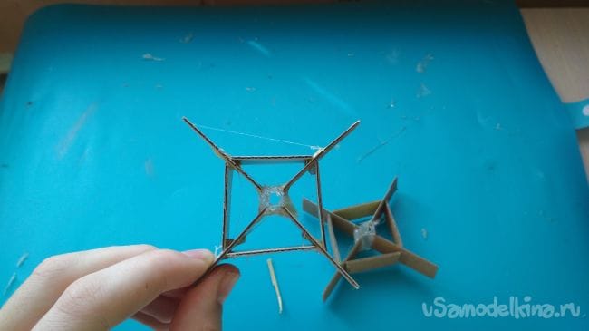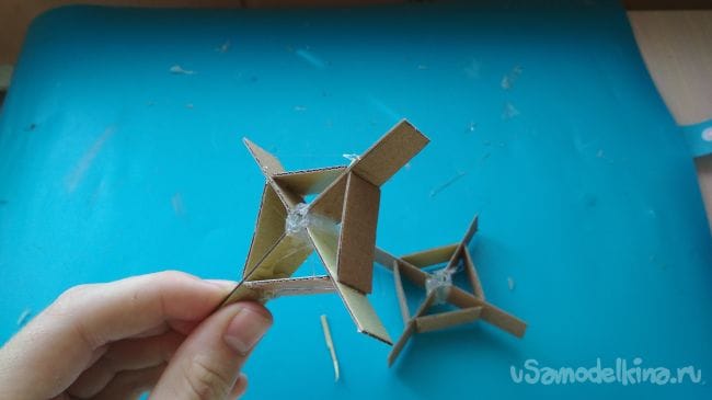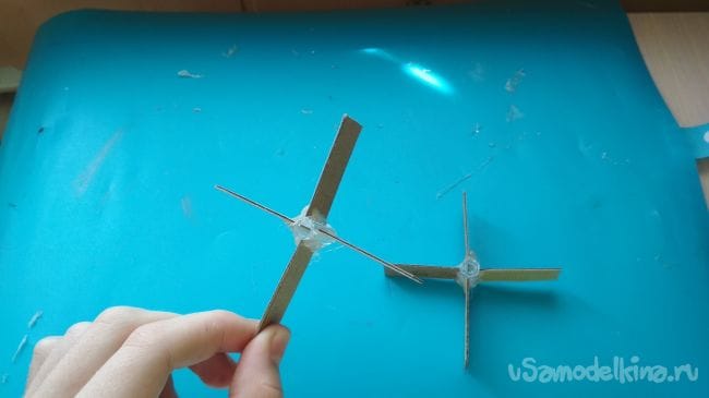 Приклеиваем наши прошлые заготовки к каждому кусочку трубочки по 4 штуки, так как показано на фото:
