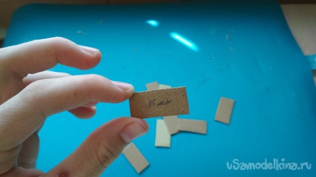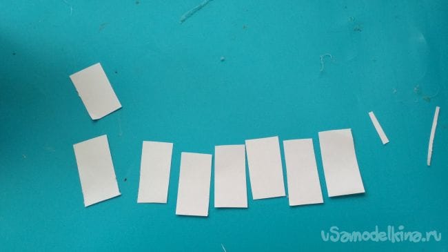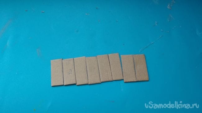 Теперь из того же картона вырезаем 8 кусочков по 35 мм в длину и 15 мм в ширину:
