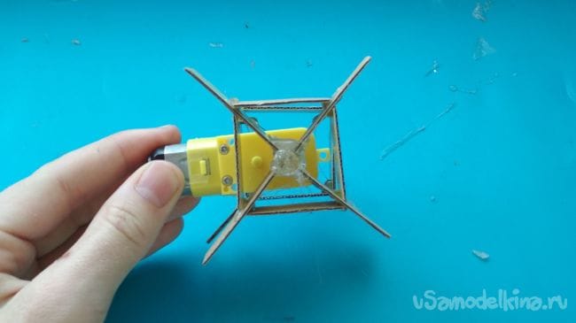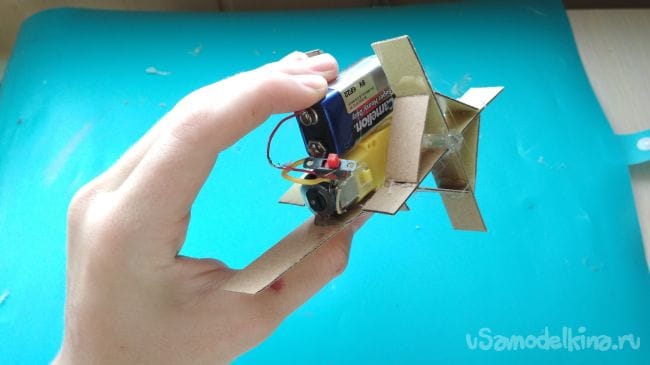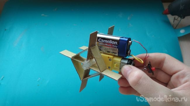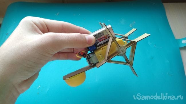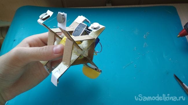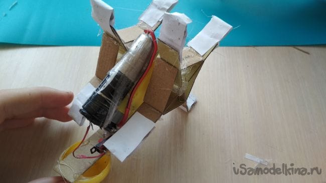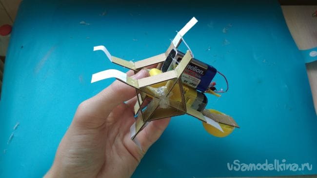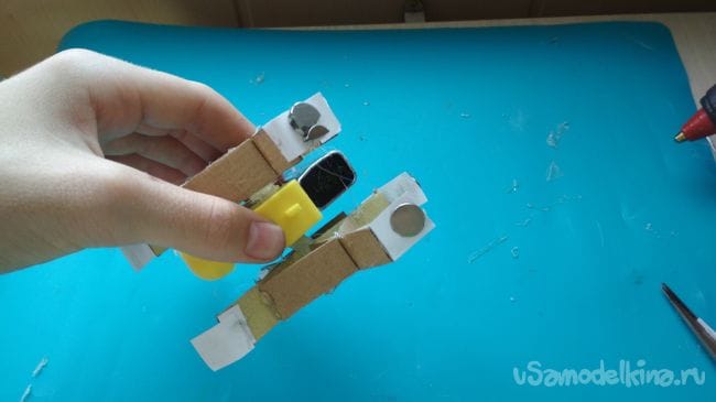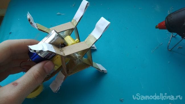 Приклеиваем источник питание поверх редуктора, так чтобы наши "колёса" не задевали его: