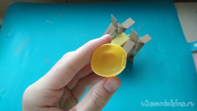Берём баночку от киндера и отрезаем от неё крышку, затем делаем два небольших надрезов и загибаем так как показано на фото, это нужно для того чтобы крышка лучше приклеилась к картонке