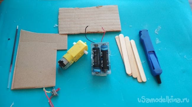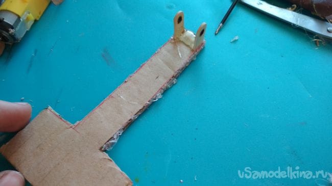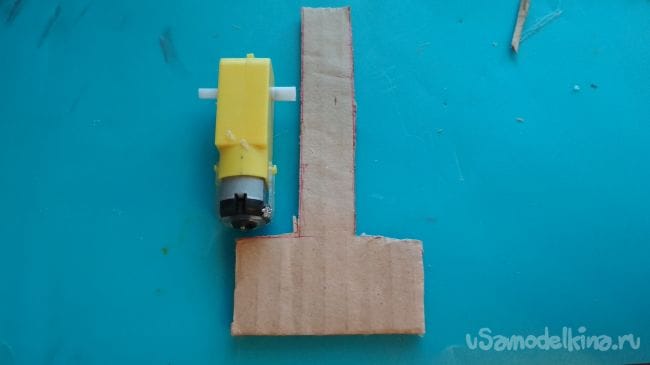 И так первым делом вырезаем из картона Т образную фигуру, в длину на 7 см больше чем редуктор, главное чтобы каркас был не шире оси редуктора и чтобы на нём уместились и редуктор и питание: