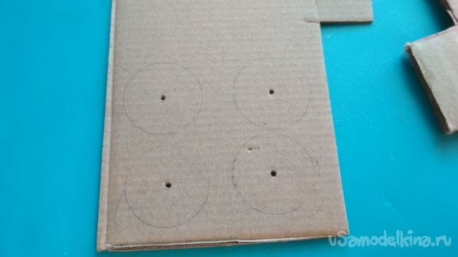 С помощью паяльника проделываем два отверстия, они должны на таком же расстояние что и верхние отверстия у картонных кружочков: