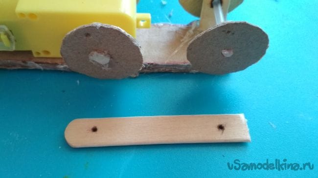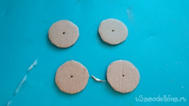 На двух кружочках увеличиваем центральное отверстие и приклеиваем из на ось редуктора, так чтобы отверстия с краю были напротив друг к другу. Также важно чтобы ось редуктора сильно не выступала за кружочки: