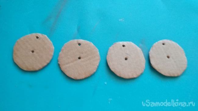 Проделываем с помощью иголки или шила по одному отверстию на каждом из кружочков, примерно в 4 мм от края: