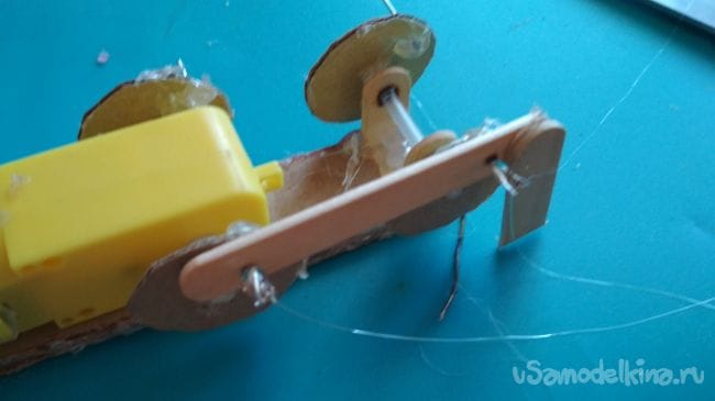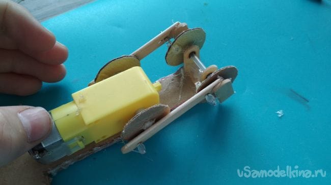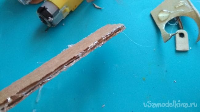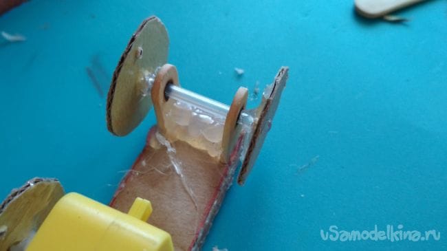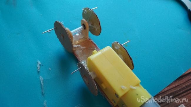 Отрезаем от стержня ручки кусочек длиной 30 мм и вставляем его в отверстия наших заготовочек, также приклеиваем редуктор. Между редуктором и концом каркаса должно быть расстояние 4-5 см