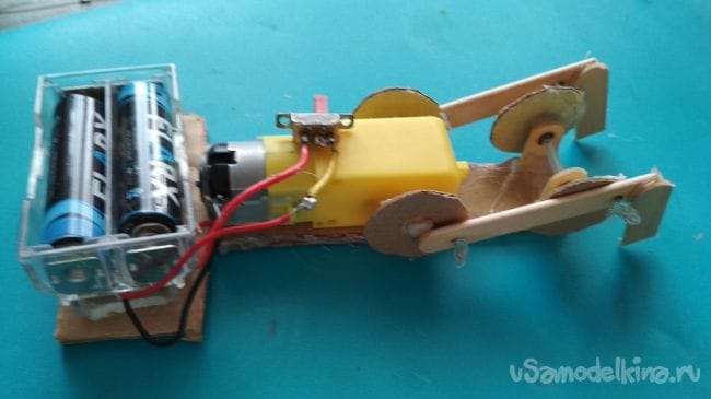[/centerНу вот и всё! Наш простейший "шагоход" готов и осталось его только протестировать! Для этого просто берём и включаем его, после чего он начинает двигать "ногами" и немного ползти! Получается что он отталкивается ногами от поверхности, тем самым двигаю всю конструкцию. Для улучшения сцепления "ног" с поверхностью советую на их "пятку" капнуть пару капель термо клея. Надеюсь данная статья была вам интересна.