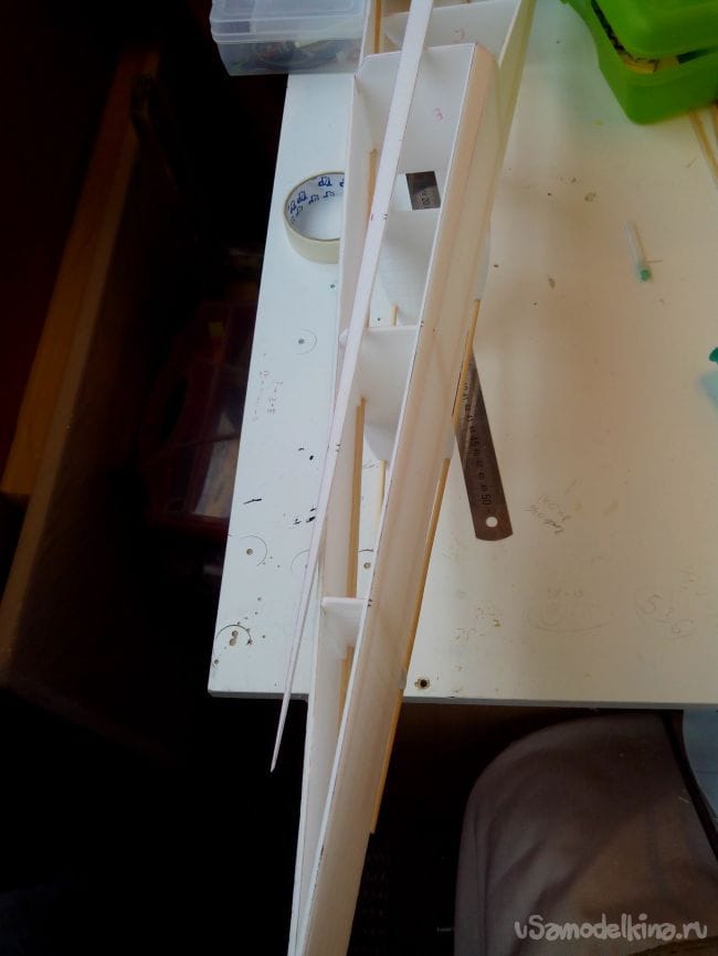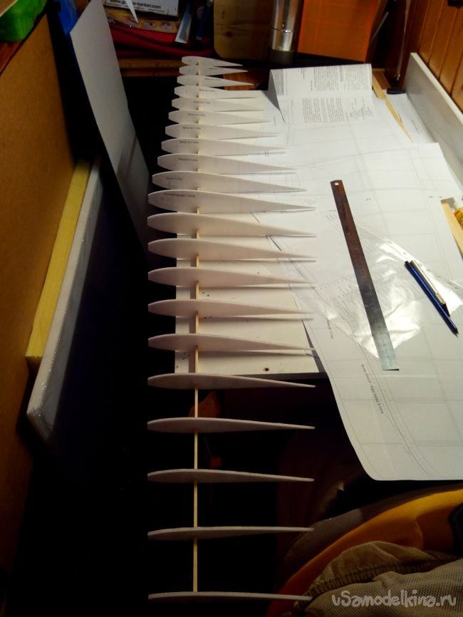 Концы нервюр обрезаем, прикинув толщину задней кромки из депрона, и приклеиваем эту кромку к нервюрам.