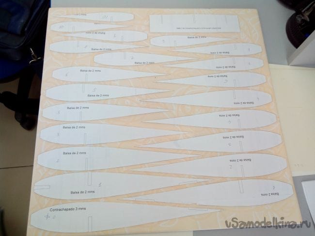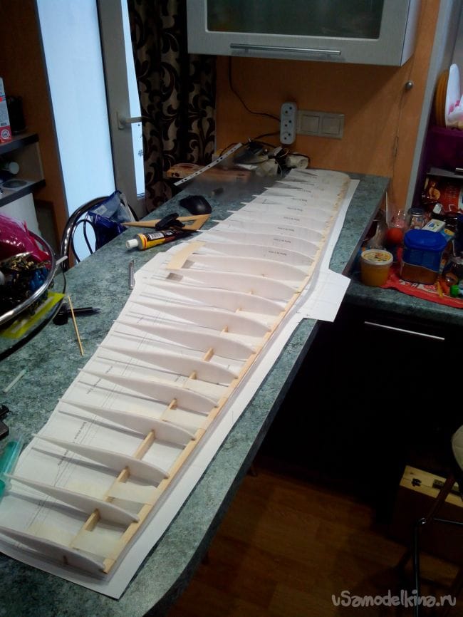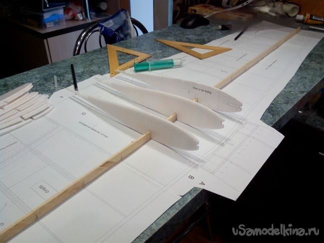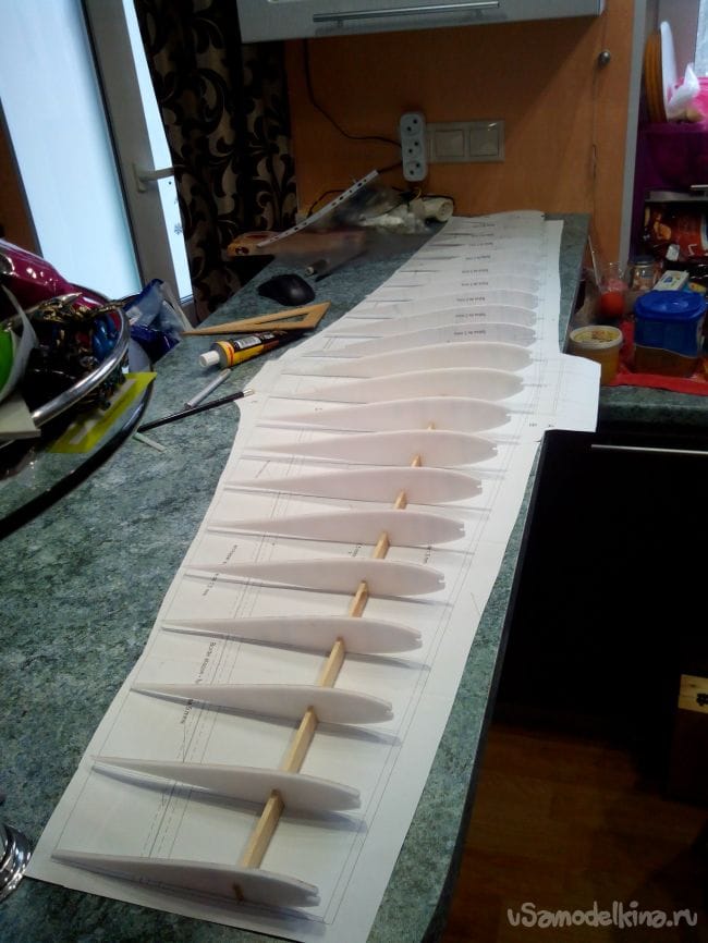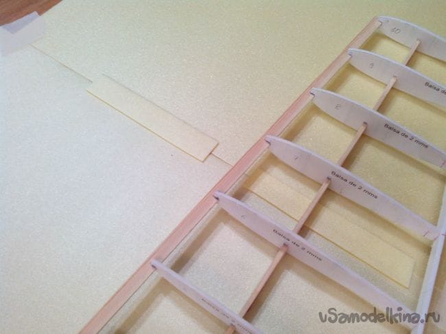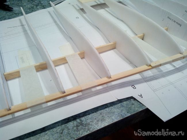 Приклеиваем нервюры к лонжерону.