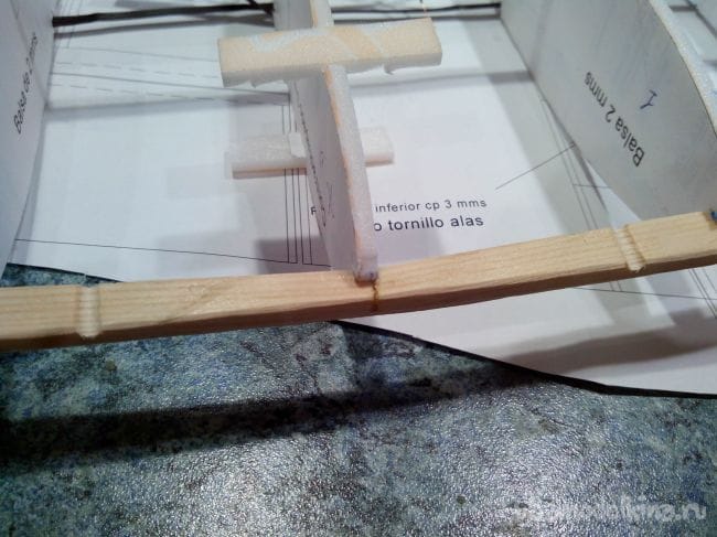 Лонжерон из сосновой рейки сечением 4х15 мм, в нервюрах делаем вырез таких же размеров.