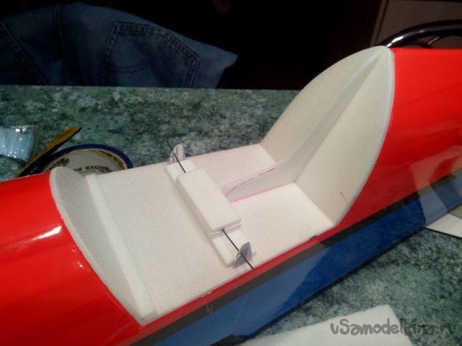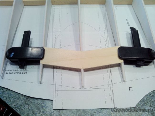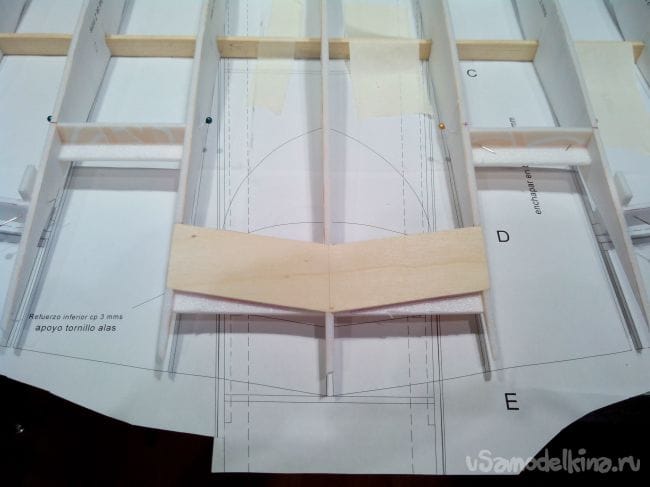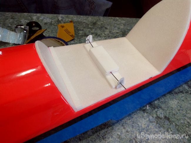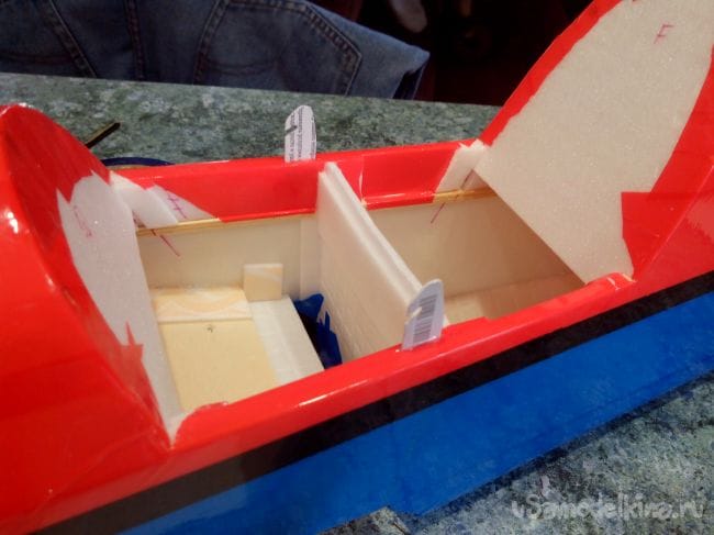 К крылу сверху приклеиваем две перегородки для того, чтобы аккумулятор не сдвигался в полете. Это место подбираем при центровке всей модели.