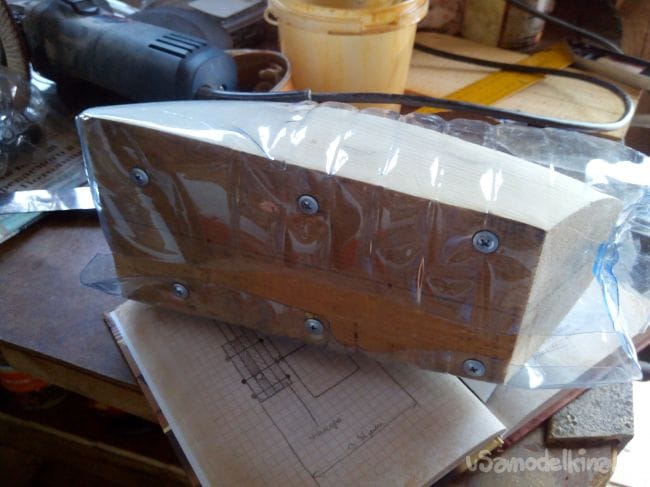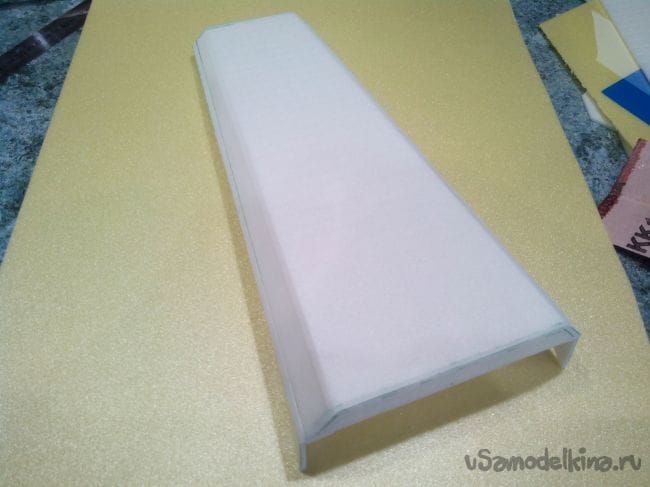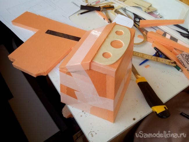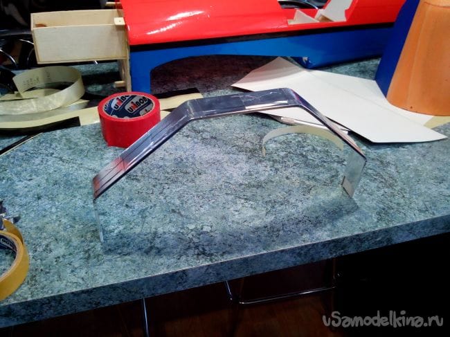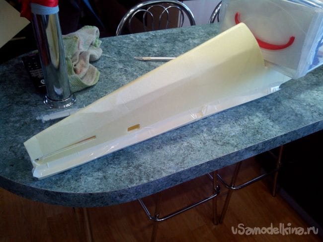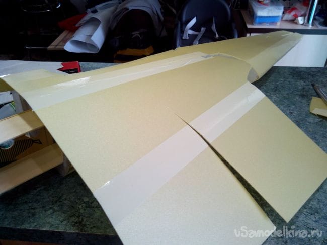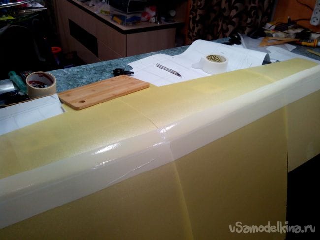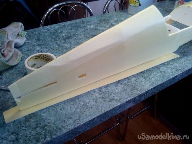 Начинаем обклеивать тонким депроном фюзеляж, на месте изгибов снаружи наклеиваем скотч, иначе лопнет депрон.