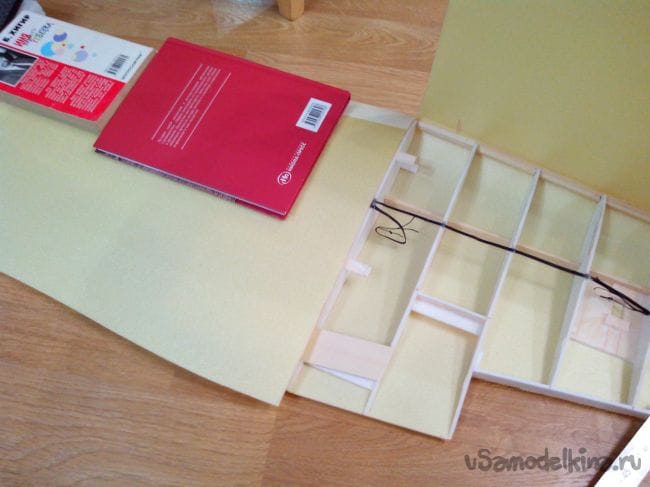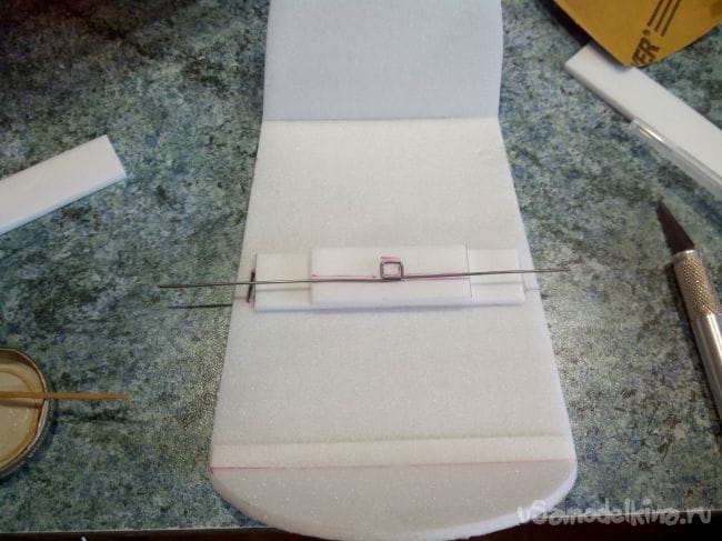 К основанию-крышке приклеиваем куски потолочки, а к ним кусок стальной проволоки. Проволока должна выступать с двух сторон фюзеляжа на пару сантиметров.