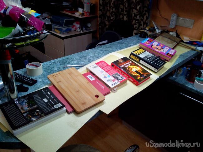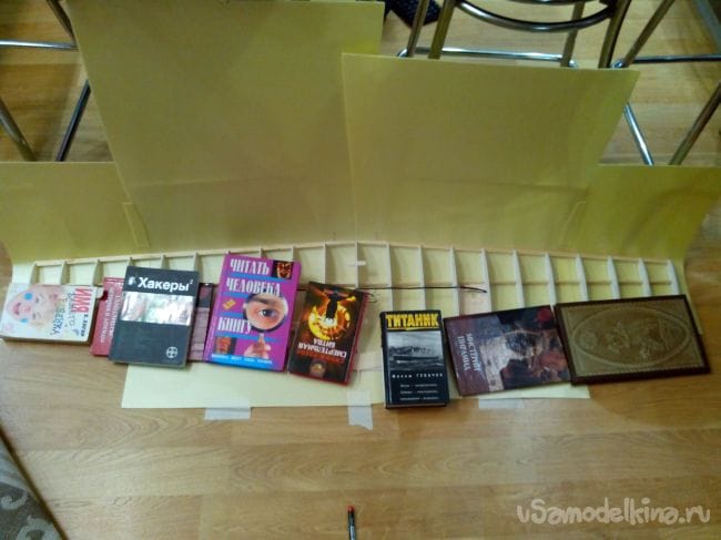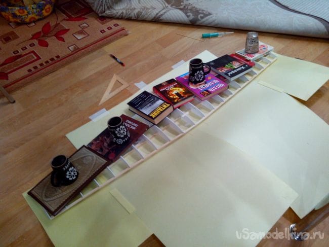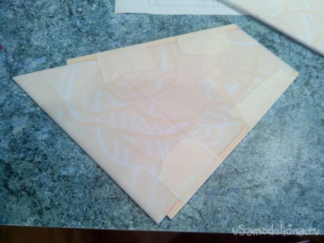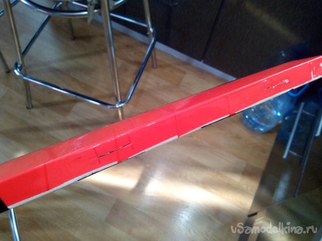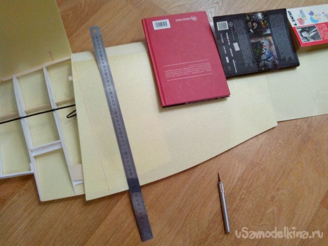 Загибаем депрон, прижимаем грузом и отрезаем по центральной нервюре.