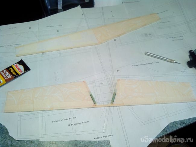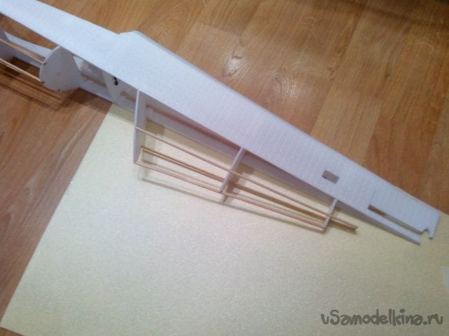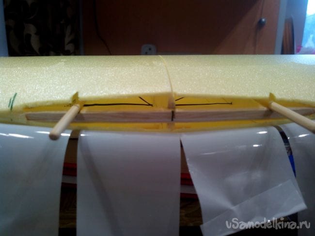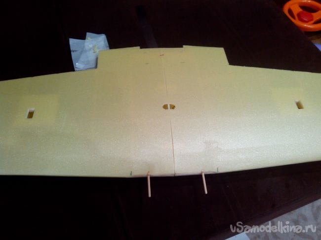 Обшивку крыла немного надрезаем в центральной части, вклеиваем штырьки из бамбуковых шпажек. Они должны выступать на 4 см и доставать до лонжерона.