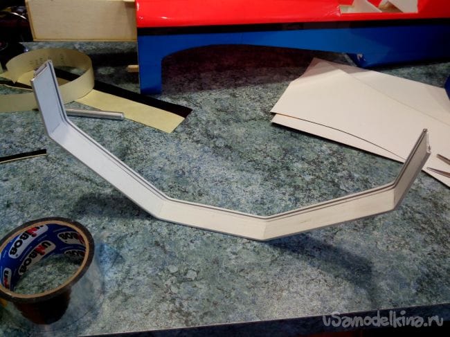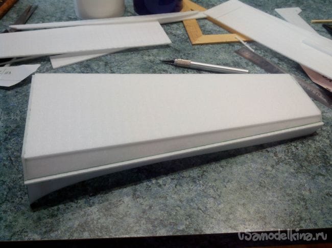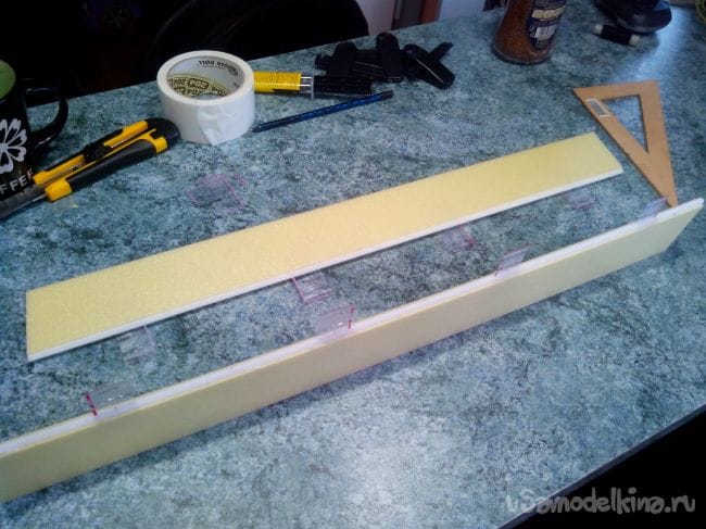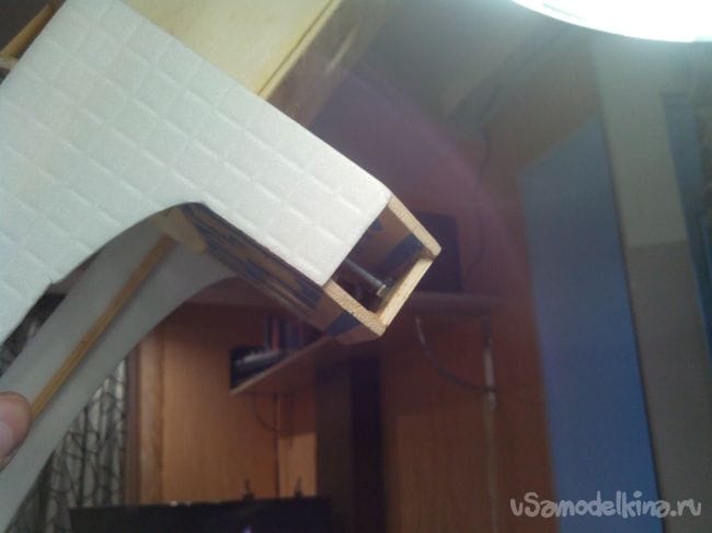 Затем приклеиваем депрон к передней кромке, загнув его немного.
