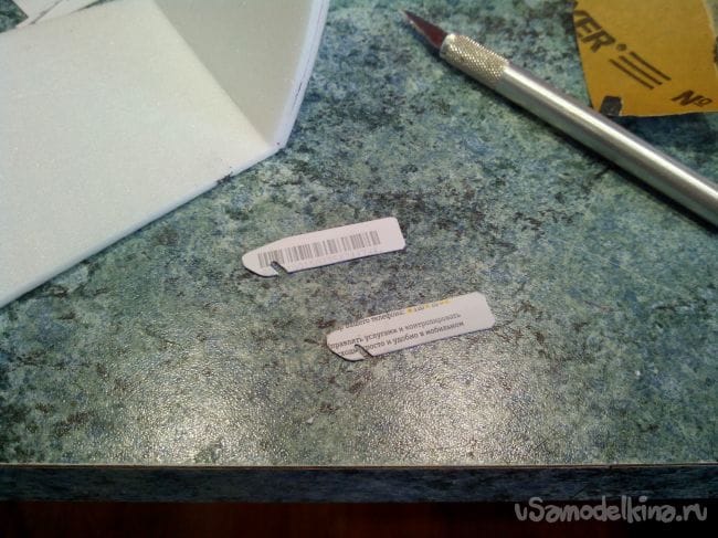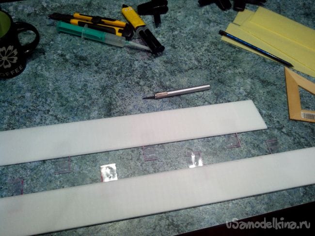 Приступаем к изготовлению элеронов. Из депрона вырезаем полоски и сошкуриваем края под углом. Затем делаем петли из тонкого пластика и скоб от степлера.