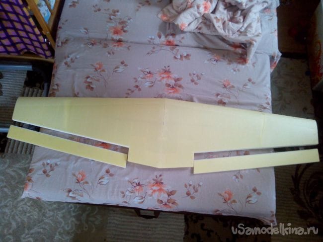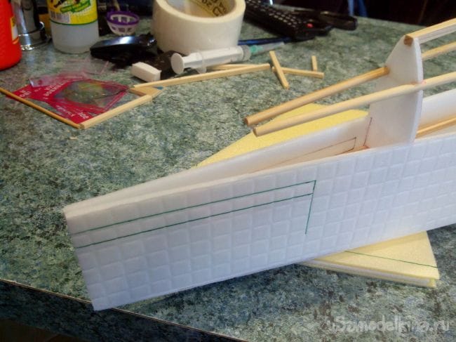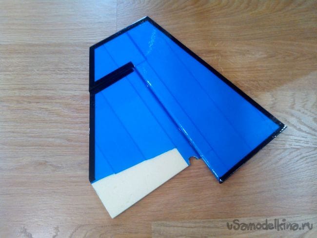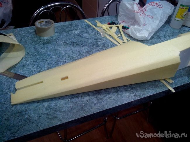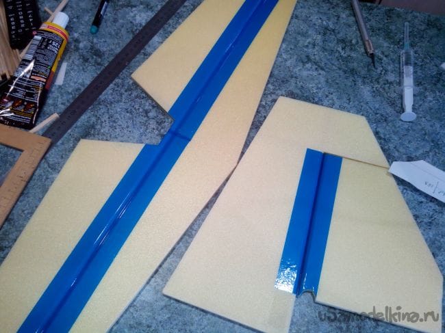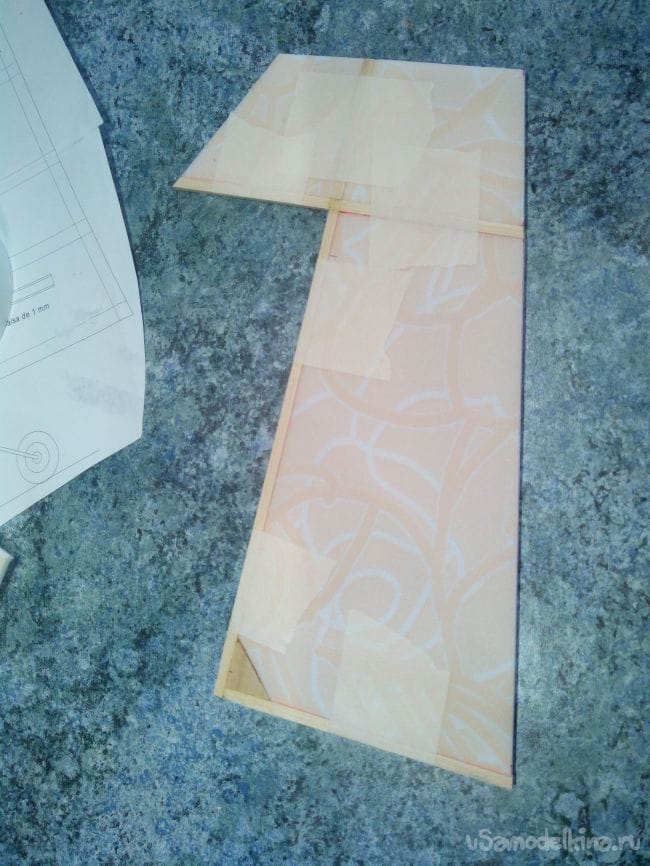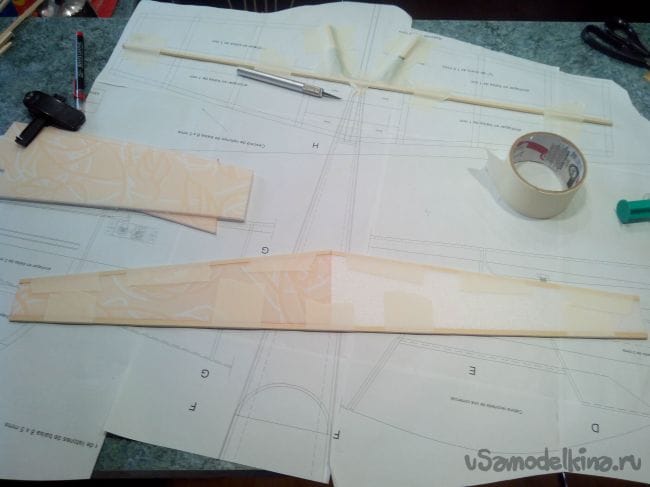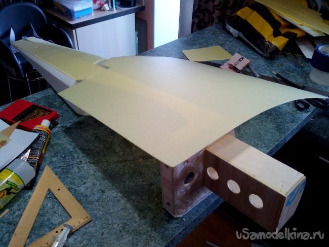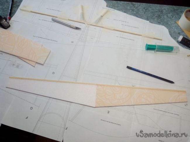Затем обклеиваем полученные стабилизатор и киль с обеих сторон тонким депроном.