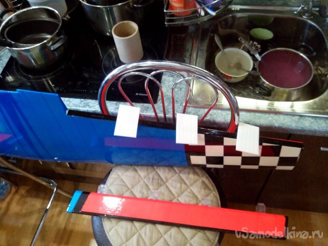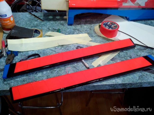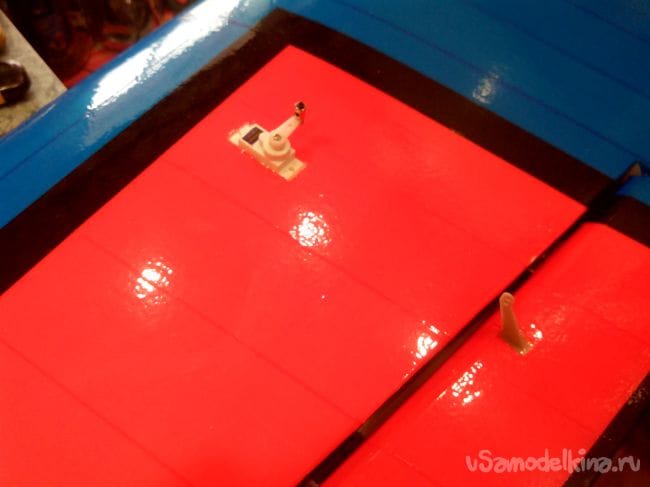 По борту приклеиваем черную полоску на стыке красного и синего.