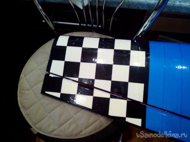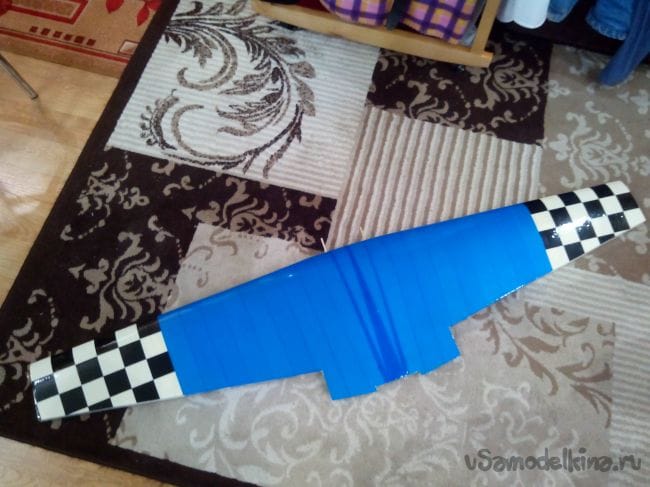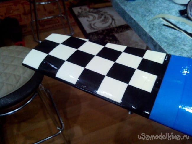 Обклеиваем хвостовое оперение синим скотчем, только низ стабилизатора в шашечку.