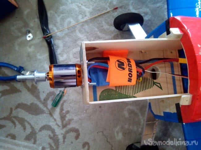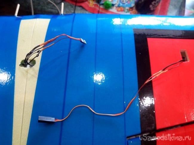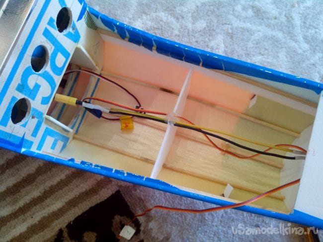 Провода от регулятора протягиваем внутри фюзеляжа и приклеиваем термоклеем к шпангоуту.