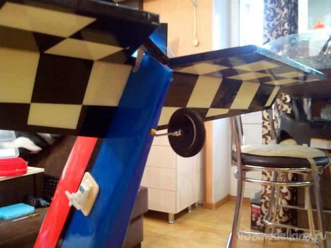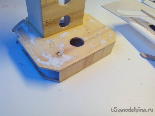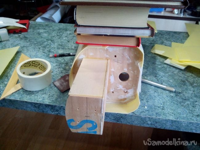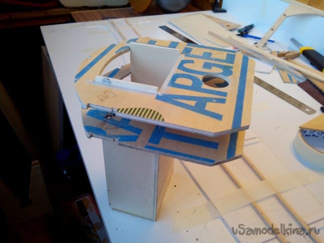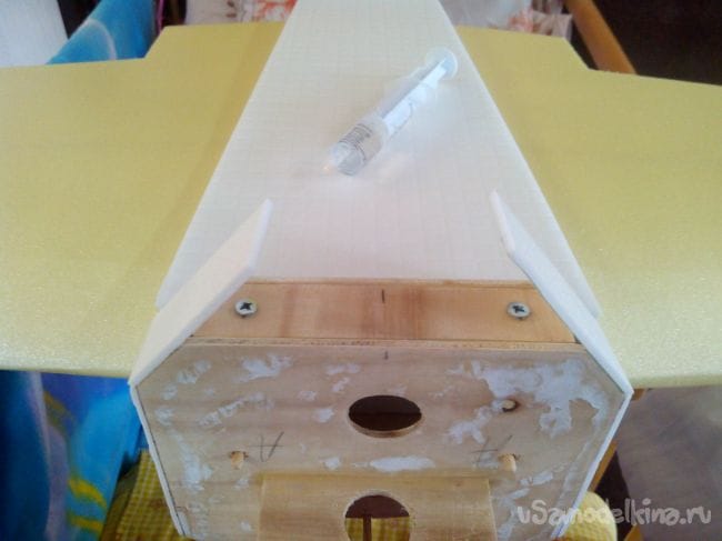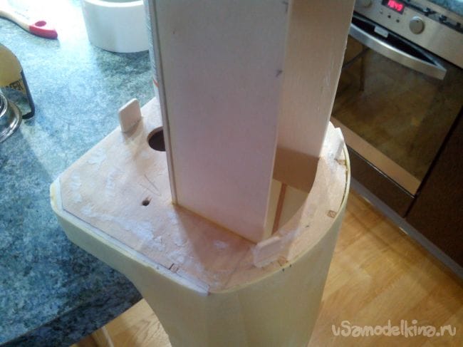 Из фанеры выпиливаем площадку под саморезы крепления крыла и вклеиваем.