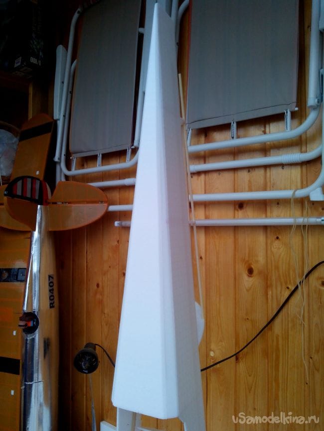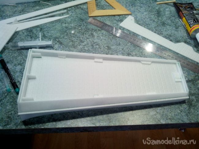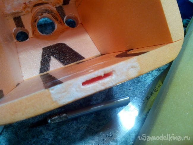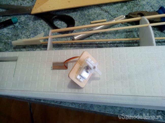 Из кусков потолочной плитки вырезаем посадочные места под сервоприводы элеронов. Можно усилить полосками потолочки или пеноплекса.