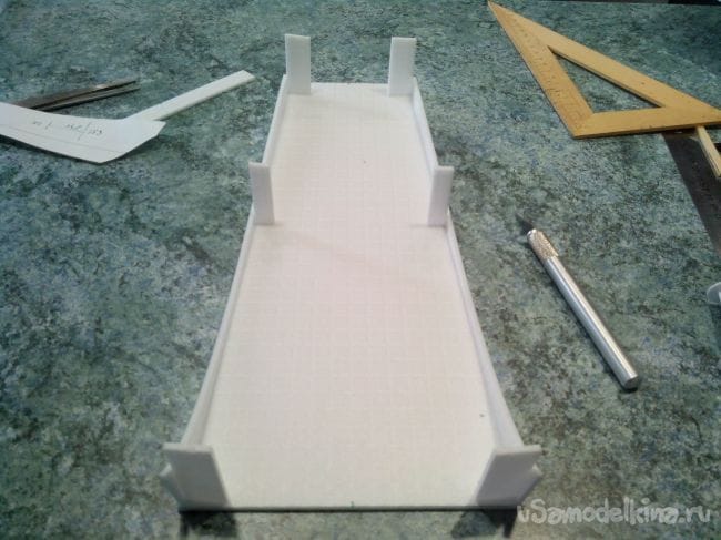 Киль вырезаем из потолочной плитки и также приклеиваем рейки.