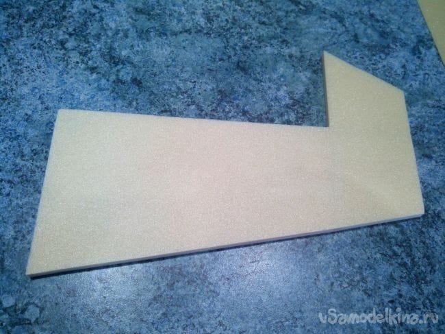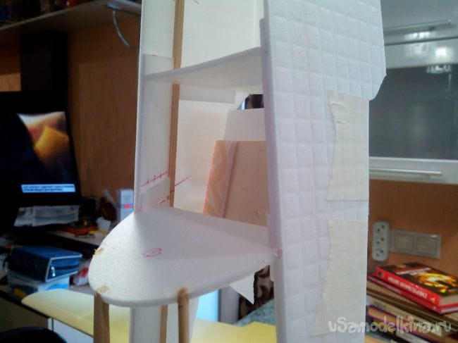 Низ хвоста обклеиваем цельным куском депрона, но сначала вклеиваем под стабилизатор небольшую фанерную площадку для более жесткой фиксации стойки заднего шасси.