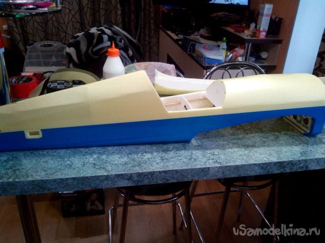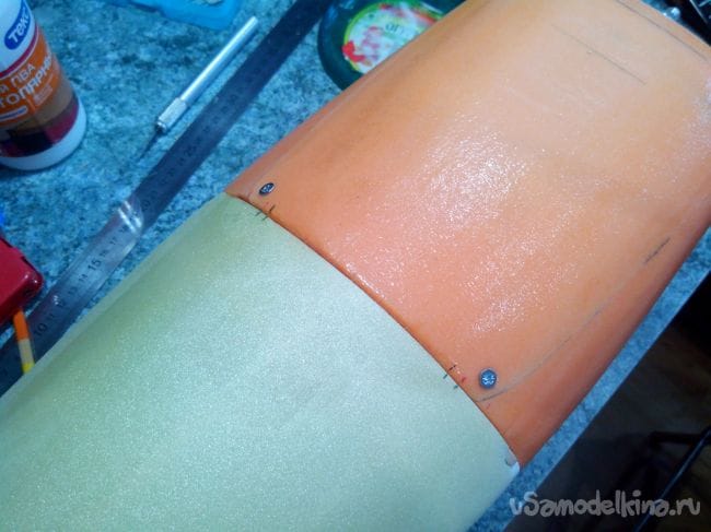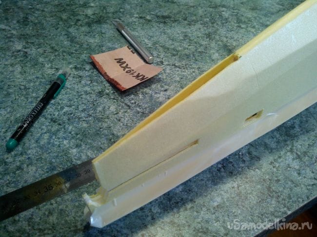 Затем приклеиваем эпоксидкой обшивку и делаем в задней части вырез, чтобы крыло вмещалось в фюзеляж. Заодно можно сделать отверстия под сервоприводы и провода в центре.